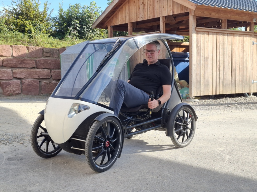 Im Bild Christoph Vogel bei einer Testfahrt im Alltags-Velomobil Pedilio