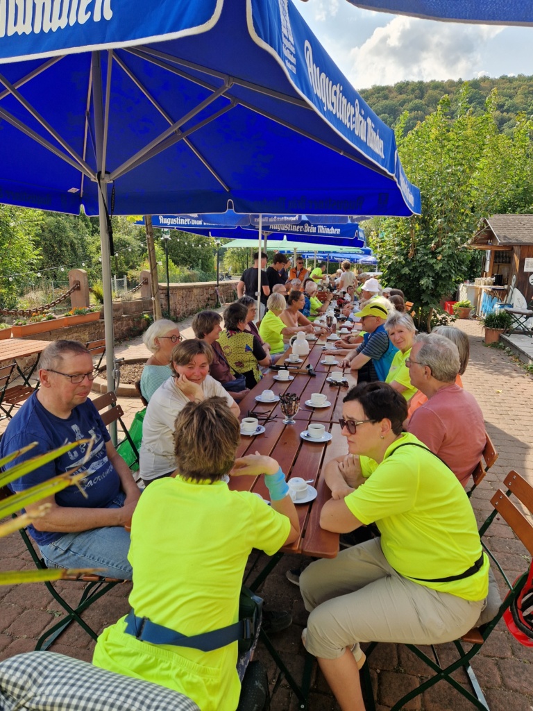 Unsere Etappe endete in Bettingen. An einer langen Tafel im Biergarten zum Anker entsponnen sich viele fröhliche Gespräche.