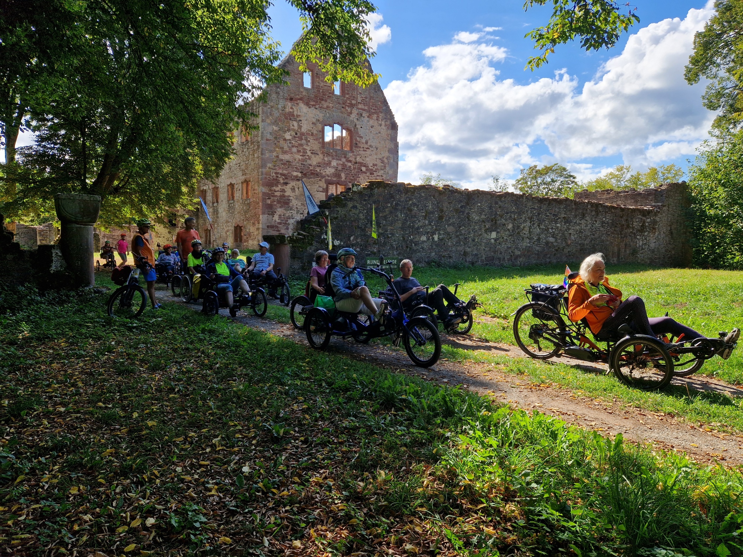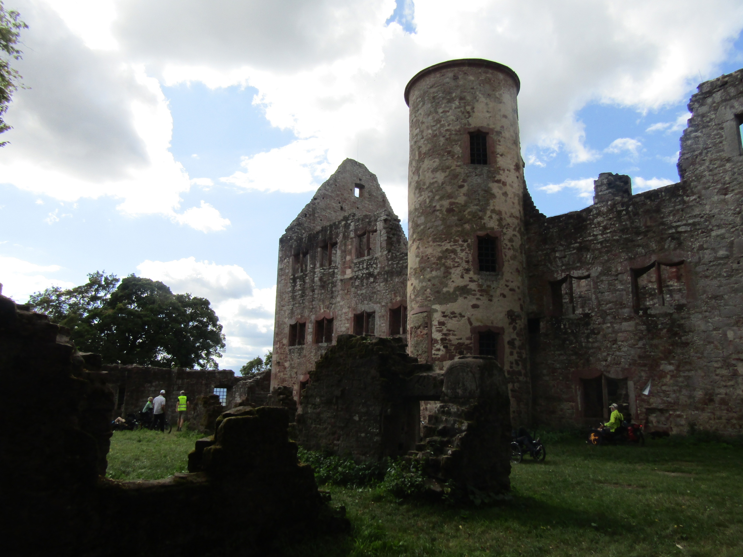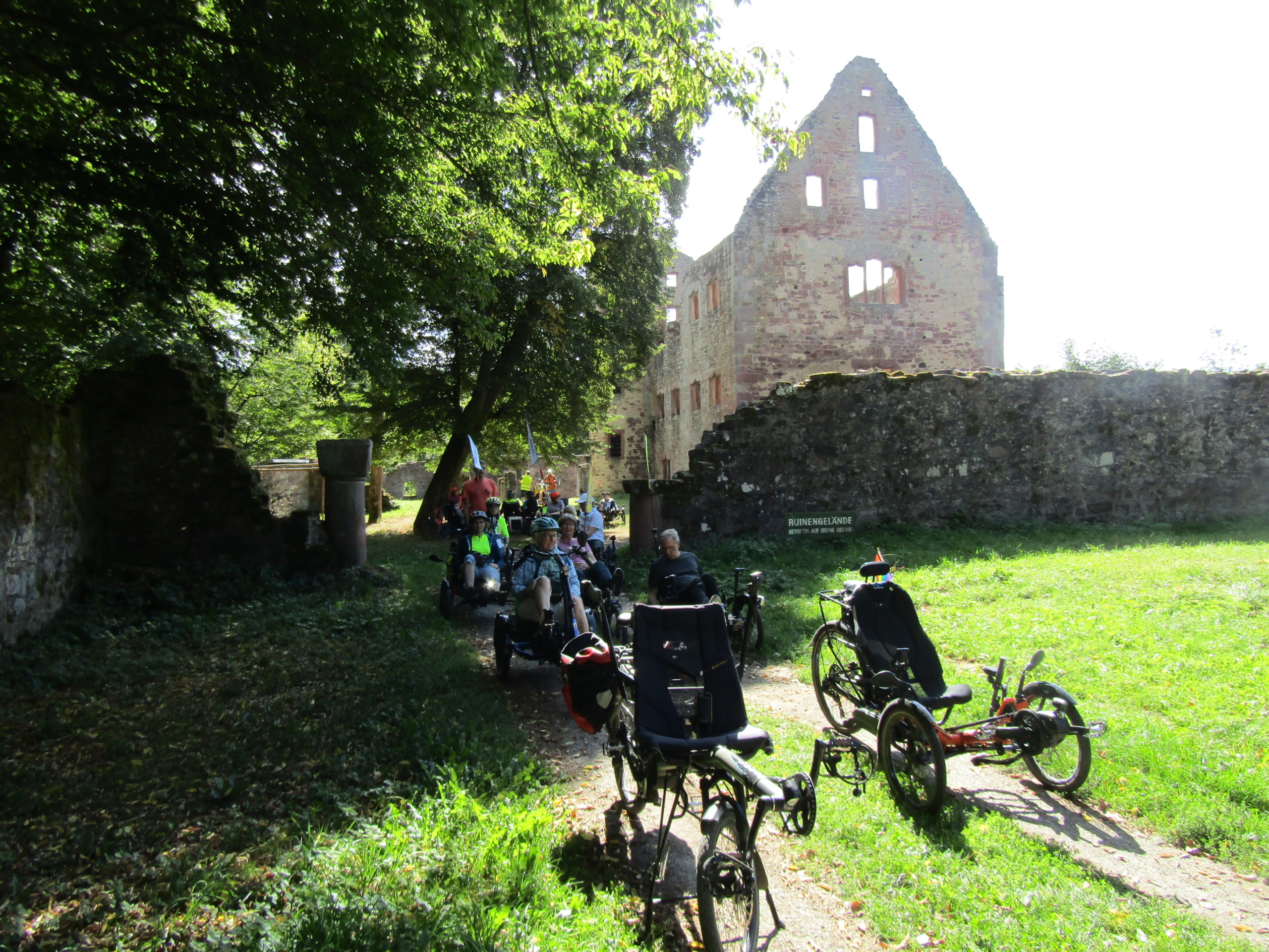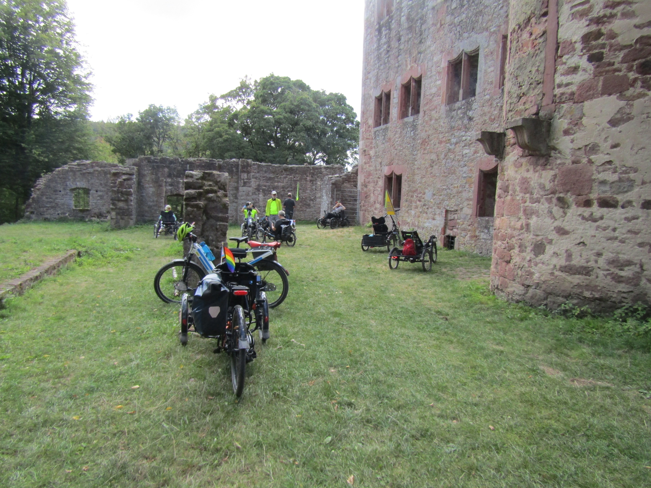 Für alle die nach unserem Rundkurs auf dem Main-Radweg noch ein kleines Abenteuer erleben wollten, boten wir eine Fahrt zur Ruine Schönrain an. Nach einer landschaftlich schönen Strecke durch das Halsbachtal bis zur Veitenmühle ging es über einen geschotterten Waldweg steil bergan und anschließend durch den herrlichen Laubwald zur Ruine Schönrain.
