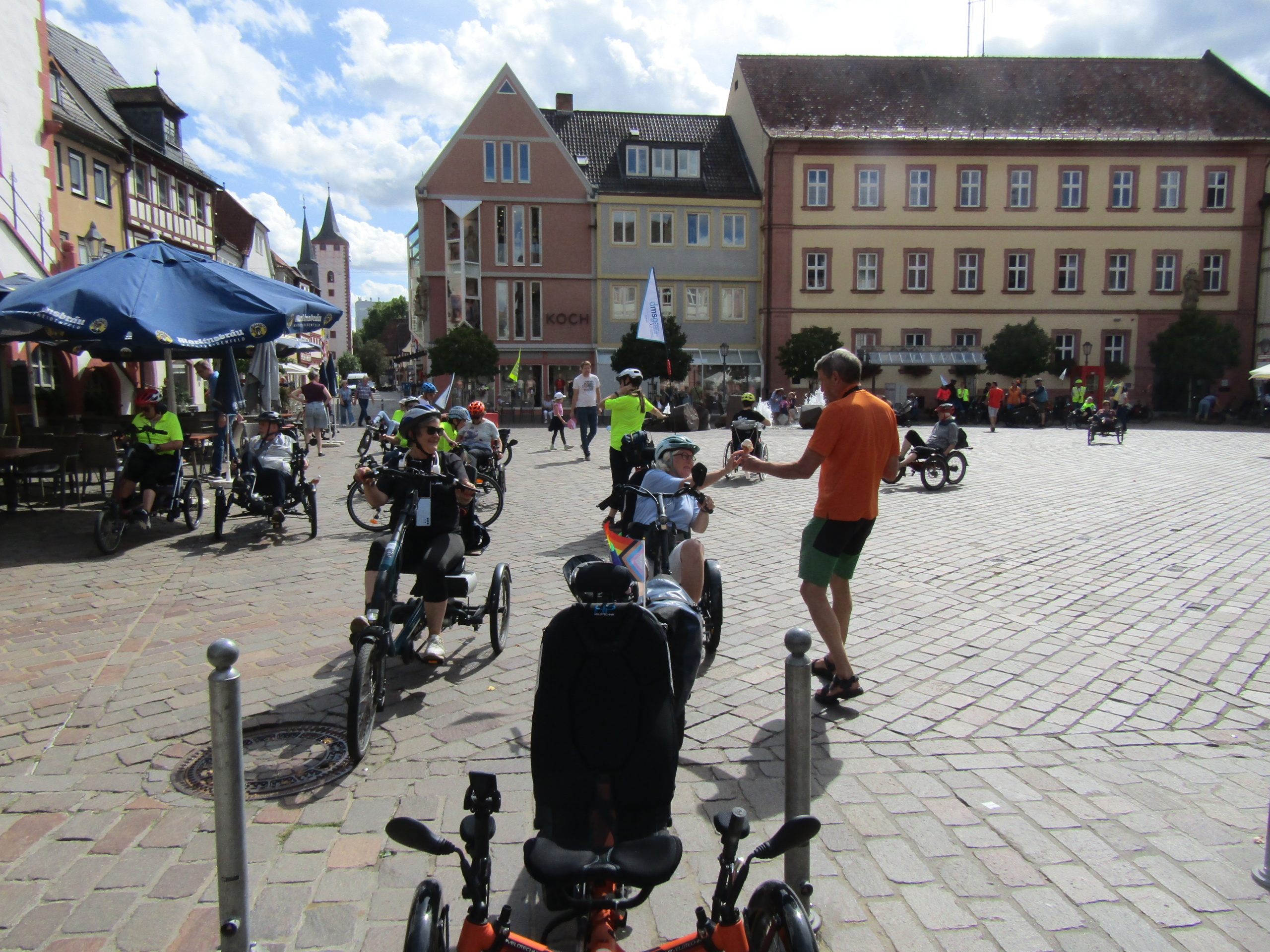 Hier wurden wir von 2. Bürgermeister Dirk Rieb empfangen, der uns auf dem Rad noch bis zum Selbsthilfecafe am Sommerberg begleitete. Dort berichtete uns Simone Hoffmann von der Selbsthilfearbeit im Landkreis Main-Spessart.