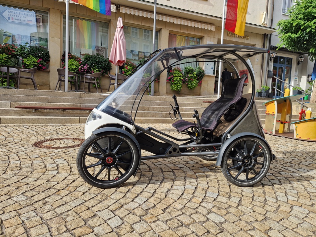 Von Speedy bekamen wir ein Handbike-Rollstuhl-Gespann ausgeliehen.